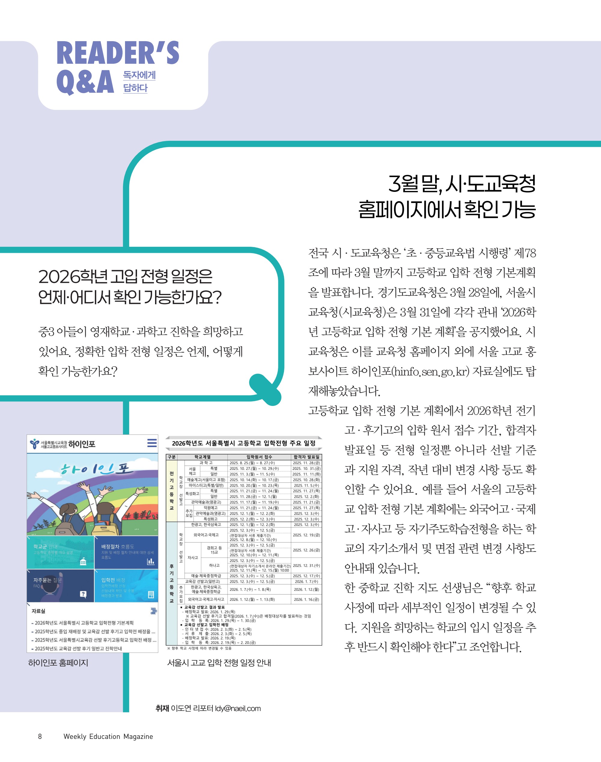 1페이지 내용 : 8 Weekly Education Magazine READER’S Q&A 독자에게 답하다 3월 말, 시·도교육청 홈페이지에서 확인 가능 전국 시·도교육청은 ‘초·중등교육법 시행령’ 제78 조에 따라 3월 말까지 고등학교 입학 전형 기본계획 을 발표합니다. 경기도교육청은 3월 28일에, 서울시 교육청 시교육청 은 3월 31일에 각각 관내 ‘2026학 년 고등학교 입학 전형 기본 계획’을 공지했어요. 시 교육청은 이를 교육청 홈페이지 외에 서울 고교 홍 보사이트 하이인포 hinfo.sen.go.kr 자료실에도 탑 재해놓았습니다. 고등학교 입학 전형 기본 계획에서 2026학년 전기 고·후기고의 입학 원서 접수 기간, 합격자 발표일 등 전형 일정뿐 아니라 선발 기준 과 지원 자격, 작년 대비 변경 사항 등도 확 인할 수 있어요. 예를 들어 서울의 고등학 교 입학 전형 기본 계획에는 외국어고·국제 고·자사고 등 자기주도학습전형을 하는 학 교의 자기소개서 및 면접 관련 변경 사항도 안내돼 있습니다. 한 중학교 진학 지도 선생님은 “향후 학교 사정에 따라 세부적인 일정이 변경될 수 있 다. 지원을 희망하는 학교의 입시 일정을 추 후 반드시 확인해야 한다”고 조언합니다. 취재 이도연 리포터 ldy@naeil.com 중3 아들이 영재학교·과학고 진학을 희망하고 있어요. 정확한 입학 전형 일정은 언제, 어떻게 확인 가능한가요? 2026학년 고입 전형 일정은 언제·어디서 확인 가능한가요? 하이인포 홈페이지 서울시 고교 입학 전형 일정안내